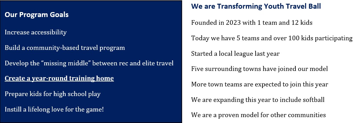 With your support, we are establishing a dedicated indoor training facility that will anchor our program, strengthen local town teams, and ensure that every athlete—regardless of ability or resources—can grow, compete, and thrive.